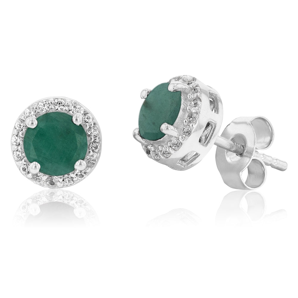 Sterling Silver Natural Enhanced Emerald and White Zircon Stud Earrings