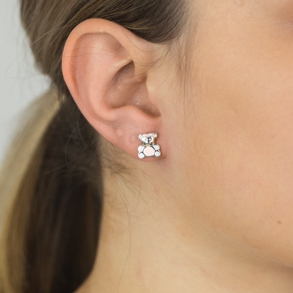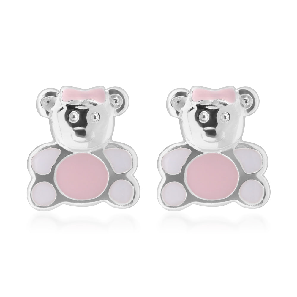 Sterling Silver Pink and White Enamel Teddy Bear Studs