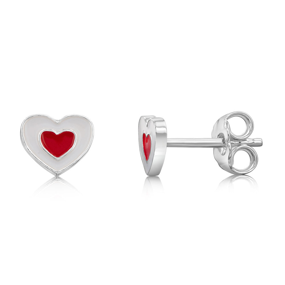 Sterling Silver Red White Enamel Heart Stud Earrings