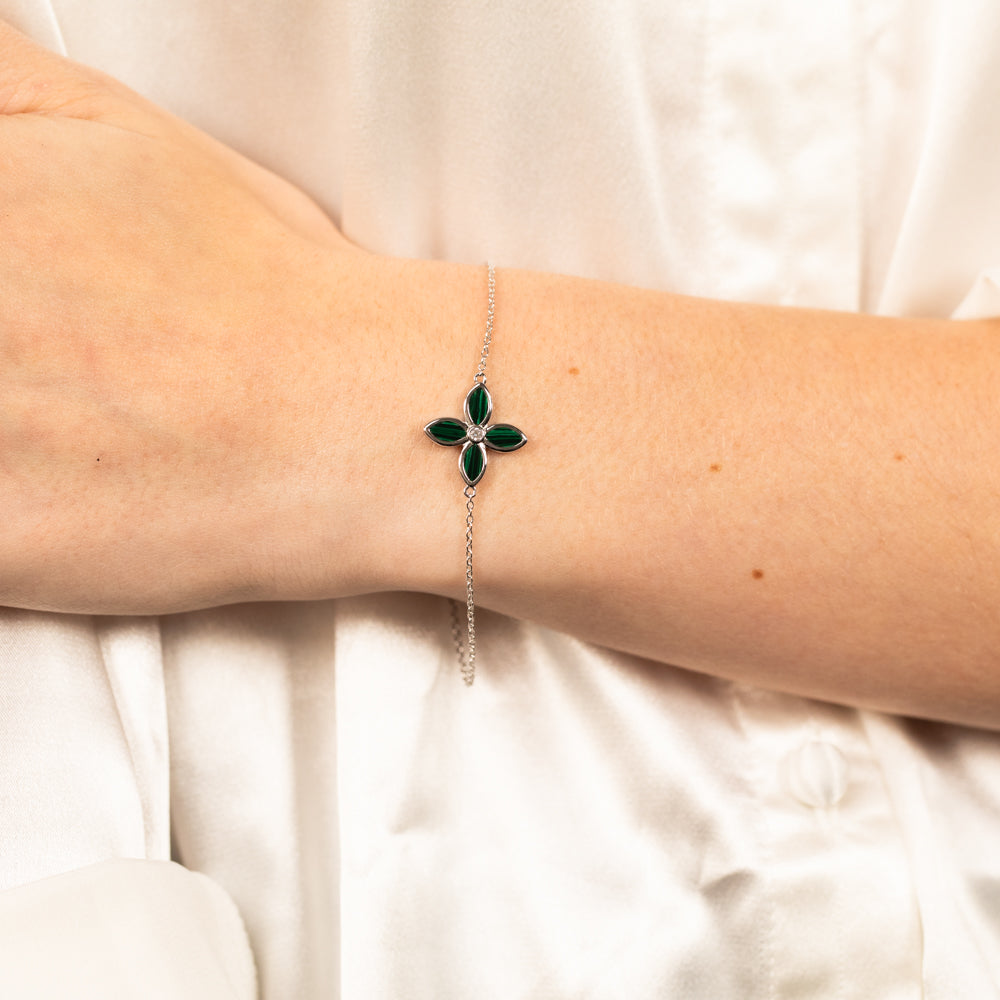 Sterling Silver Rhodium Plated Created Malachite Four Petal 16+4cm Bracelet