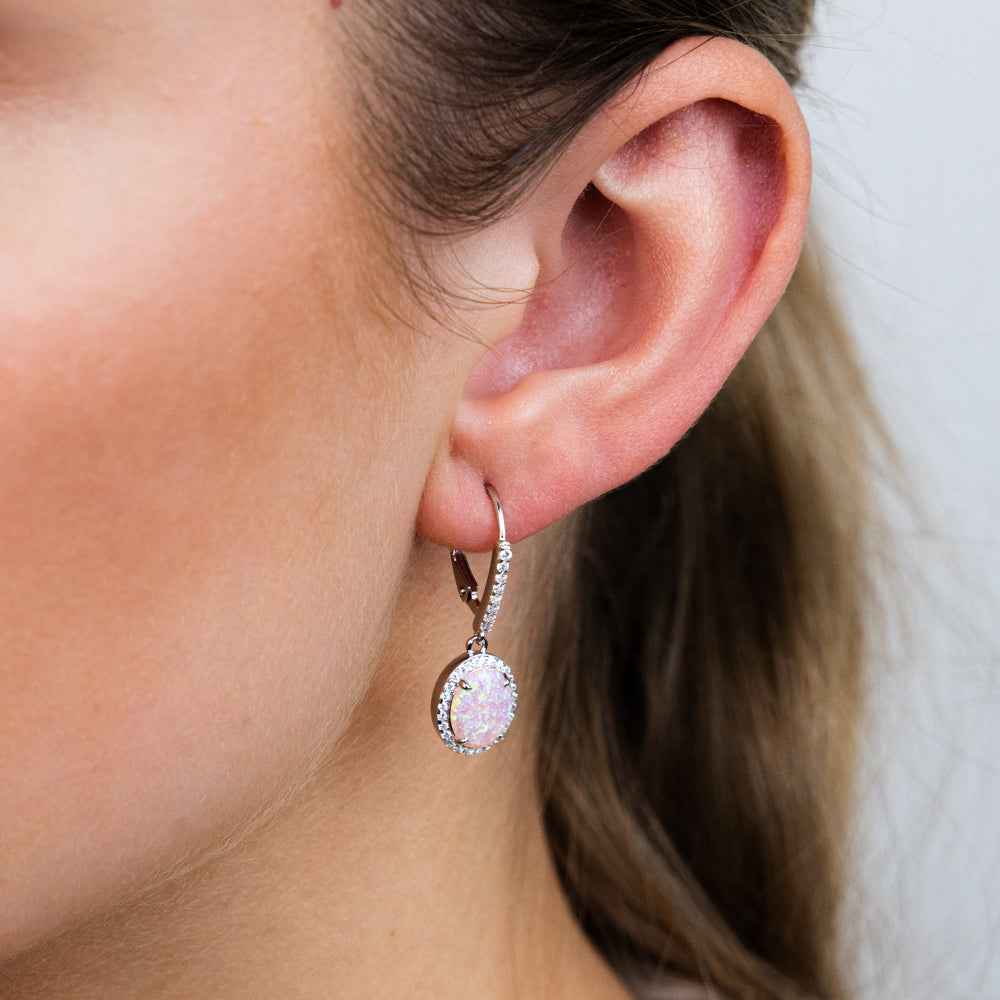 Sterling Silver Rhodium Plated Cubic Zirconia Created Pink Opal Oval Drop Earrings