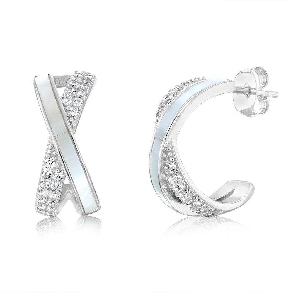 Sterling Silver Rhodium Plated Cubic Zirconia White Shell Pearl Cross Over Half Hoop Earrings