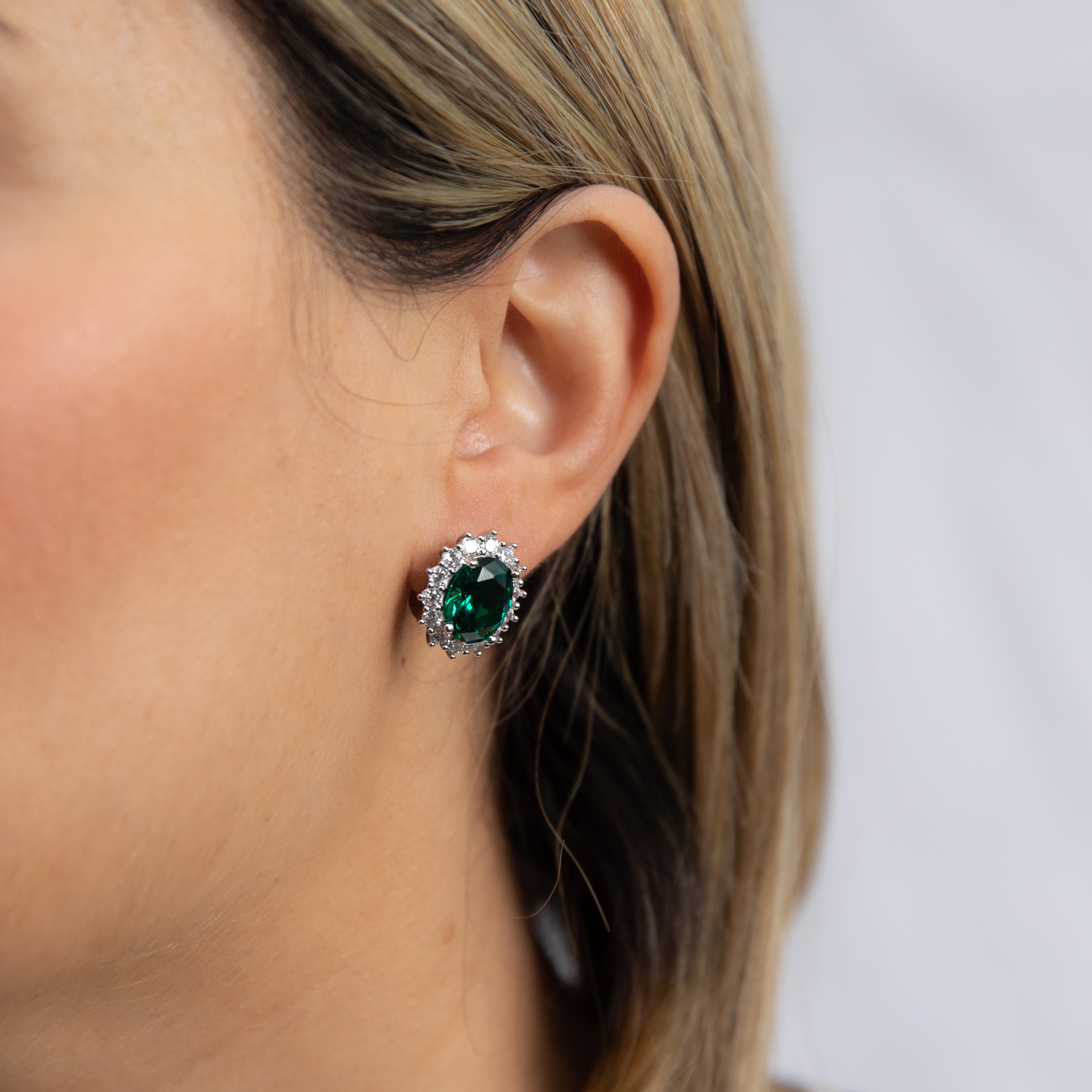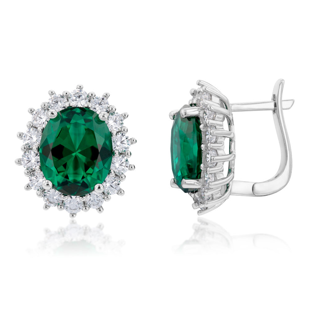 Sterling Silver Rhodium Plated Emerald-Green Cubic Zirconia Oval Earrings