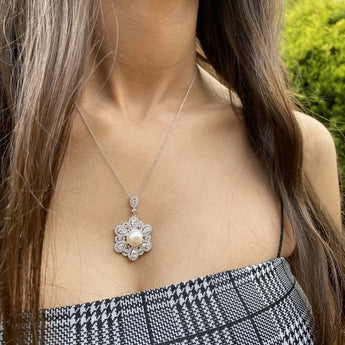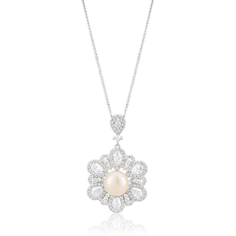 Sterling Silver Rhodium Plated Freshwater Pearl and Zirconia Pendant