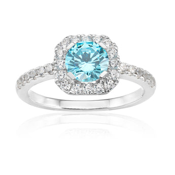 Sterling Silver Rhodium Plated Light Blue Zirconia Asscher Cut Halo Ring