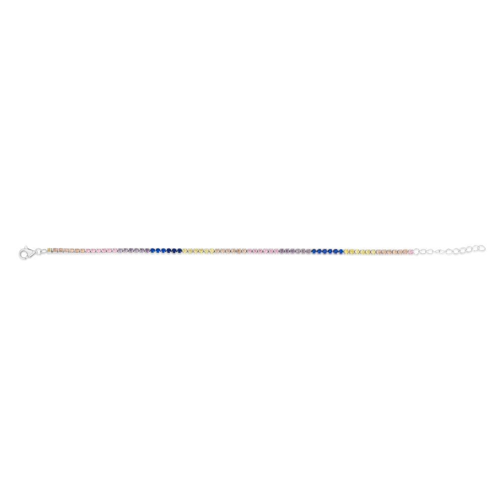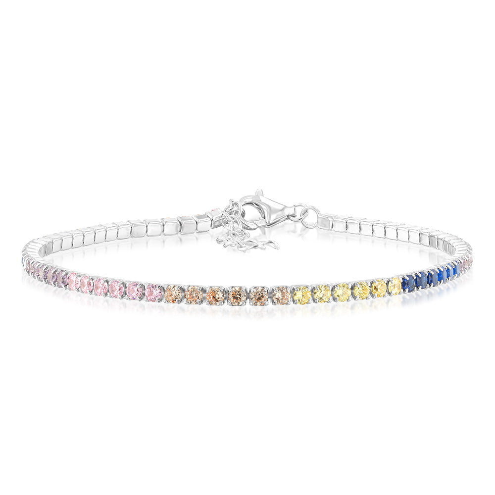Sterling Silver Rhodium Plated Multicolour Round Zirconia 16.5+3cm Tennis Bracelet