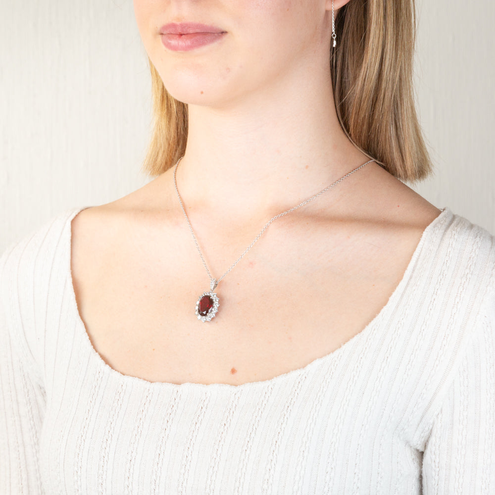 Sterling Silver Rhodium Plated Oval Red Stone Cubic Zirconia Pendant With 45cm Chain