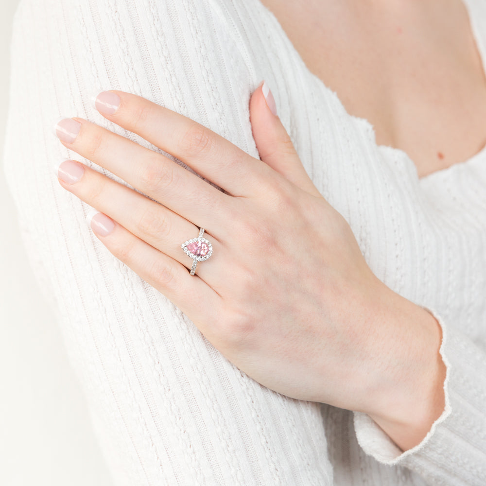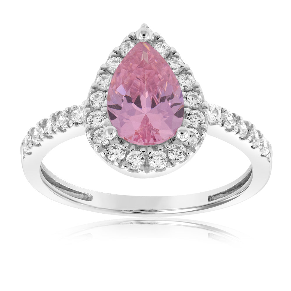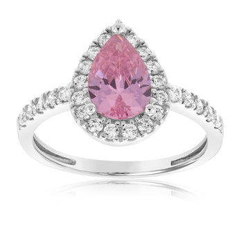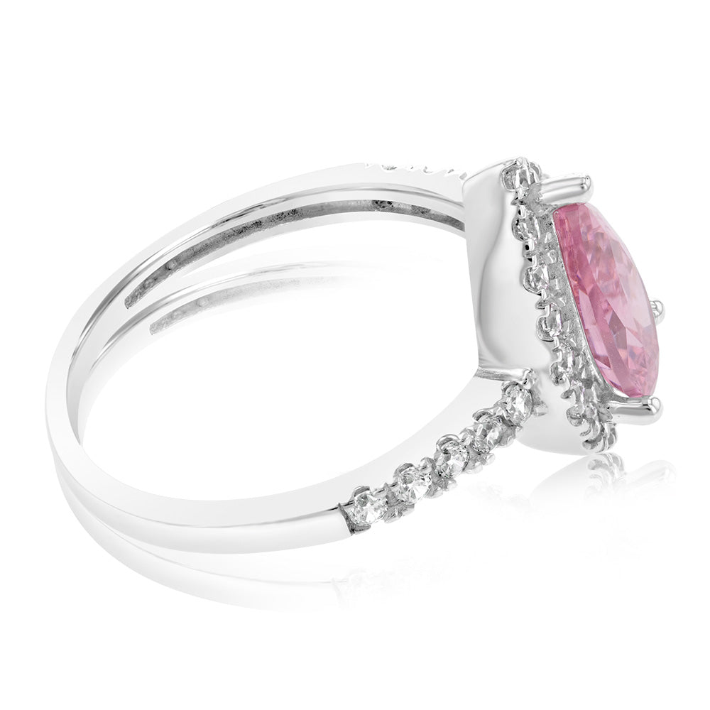 Sterling Silver Rhodium Plated Pink Cubic Zirconia Pear Ring