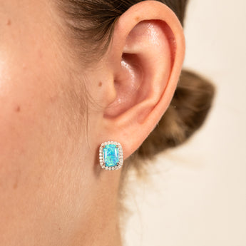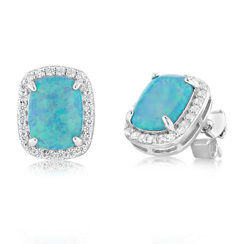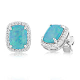 Sterling Silver Rhodium Plated Rectangle Created Turquoise Opal And White Zirconia Halo Stud Earrings