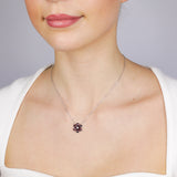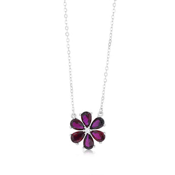 Sterling Silver Rhodium Plated Red Cubic Zirconia Flower Pendant On Chain