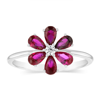 Sterling Silver Rhodium Plated Red Cubic Zirconia Flower Ring
