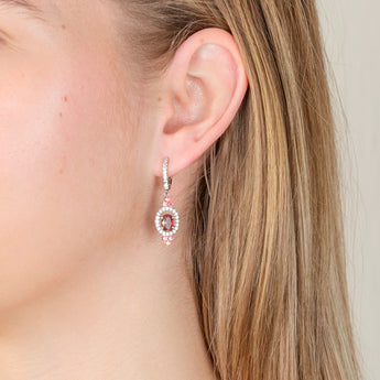 Sterling Silver Rhodium Plated Red Stone White Cubic Zirconia Drop Earrings