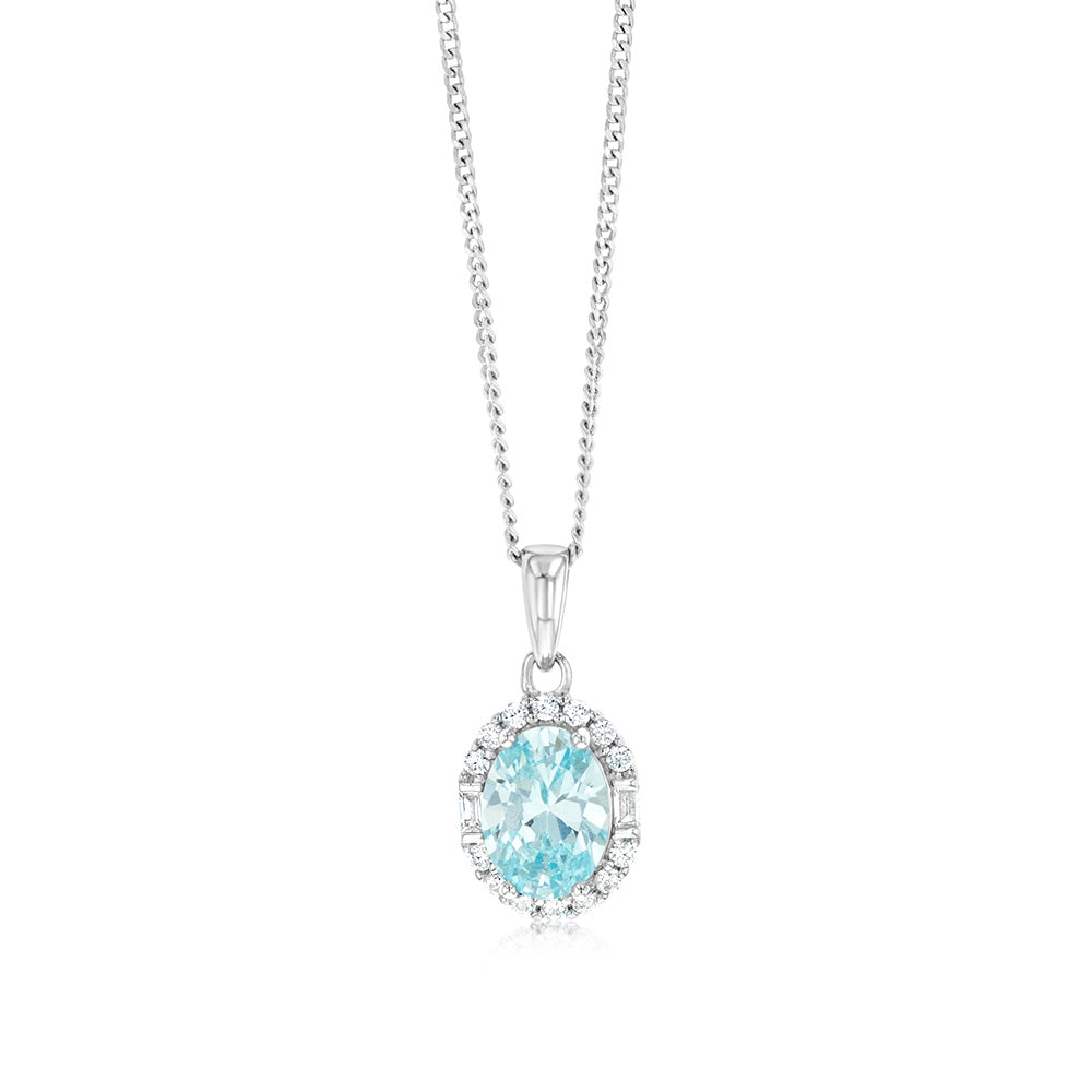 Sterling Silver Rhodium Plated White And Aquamarine Cubic Zirconia Oval Pendant