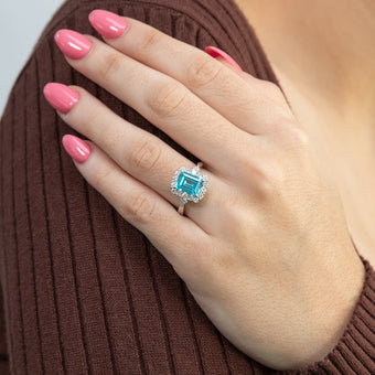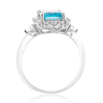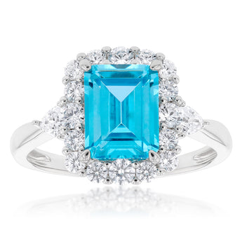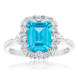 Sterling Silver Rhodium Plated White & Aquamarine Cubic Zirconia Emerald Cut Ring