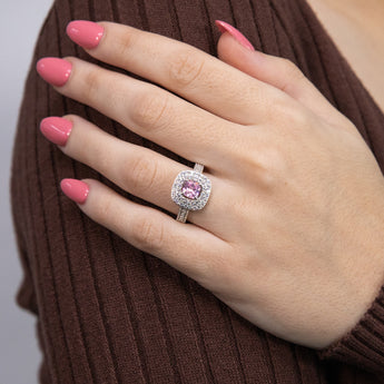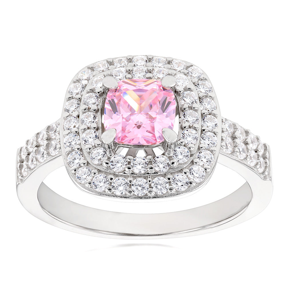 Sterling Silver Rhodium Plated White & Light Pink Cubic Zirconia Cushion Ring