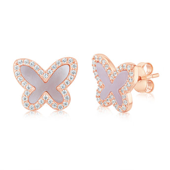 Sterling Silver Rose Gold Plated Cubic Zirconia Pink Shell Pearl Butterfly Stud Earrings