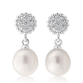 Sterling Silver White Freshwater Pearl 7.5-8mm & Zirconia Earrings