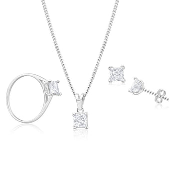 Sterling Silver Zirconia Princess Stud Pendant and Ring Jewellery Set