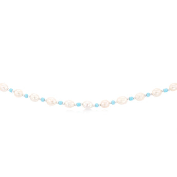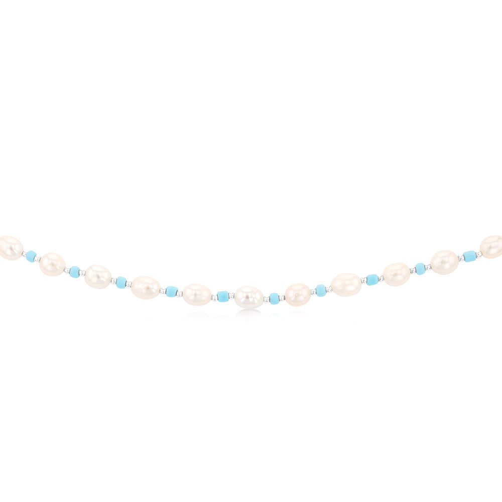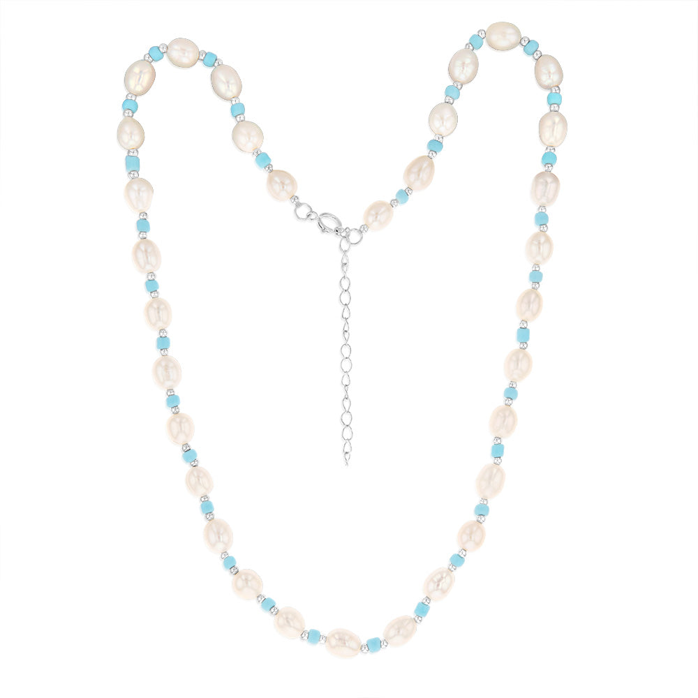 White Freshwater Pearl 42-47cm Adjustable Chain with Blue & Silver Beads in Sterling Silver