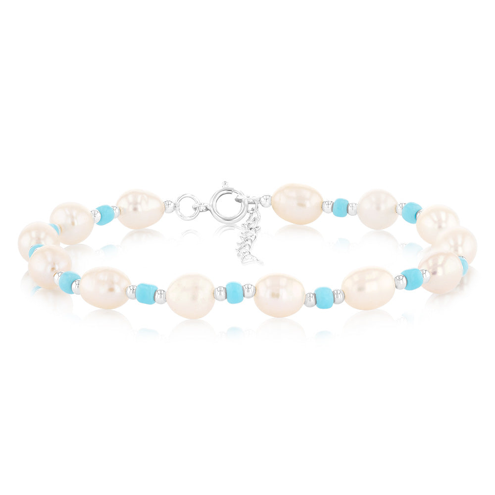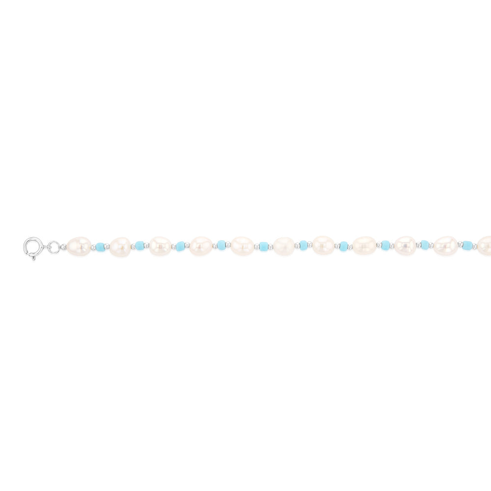 White Freshwater Pearl Bracelet with Blue & Silver Beads in Sterling Silver